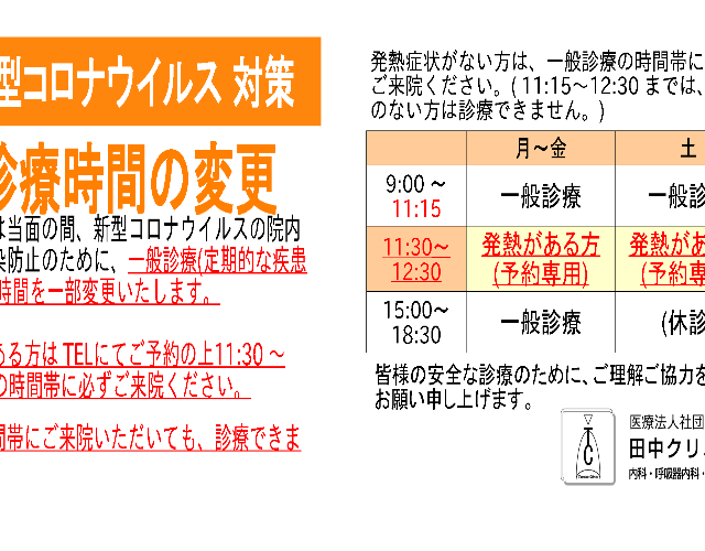 感染症の疑いのある患者さんへのお願い Posted on 2020年3月1日2020年3月1日 by 管理者 田中クリニックは、一般の診療所です。発熱や風邪などの症状も診察いたしますが、他にも呼吸器疾患などの継続的に治療が必要な方も大勢いらっしゃいます。そのために、感染症の疑いがある方は、国からの指針を守っ...